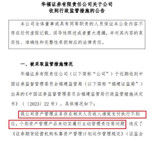 【华福证券突发!】又有券商因资管业务,被监管开出警示函!近期,华福证券公告称,其收到福建证监局出具的行政监管措施决定书。因资管业务存在两项问题,华福证券被福建证监局采取出具警示函的监管措施。对此,华福证券表示,对该行政监管措施高度重视,已积极对行政监管措施提及的问题进行整改,严格落实监管要求。(中国基金报)