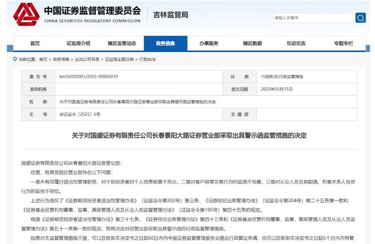 5月15日,吉林证监局发文称,经查,发现国盛证券长春景阳大路证券营业部存在未有效履行适当性管理职责,对个别投资者的个人信息核查不充分;对客户异常交易行为的监测不完善;对从业人员及其配偶、利害关系人投资行为的监控不到位。上述行为违反了相关规定。根据有关规定,吉林证监局决定对国盛证券长春景阳大路证券营业部采取出具警示函的行政监督管理措施。$国盛证券(SH751929)$