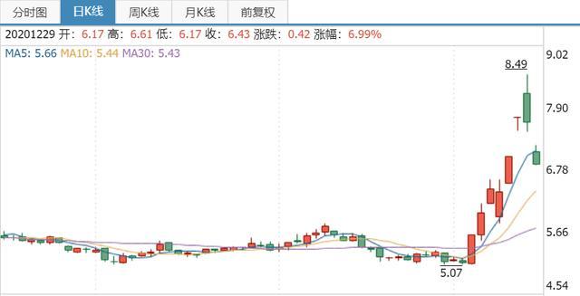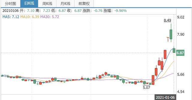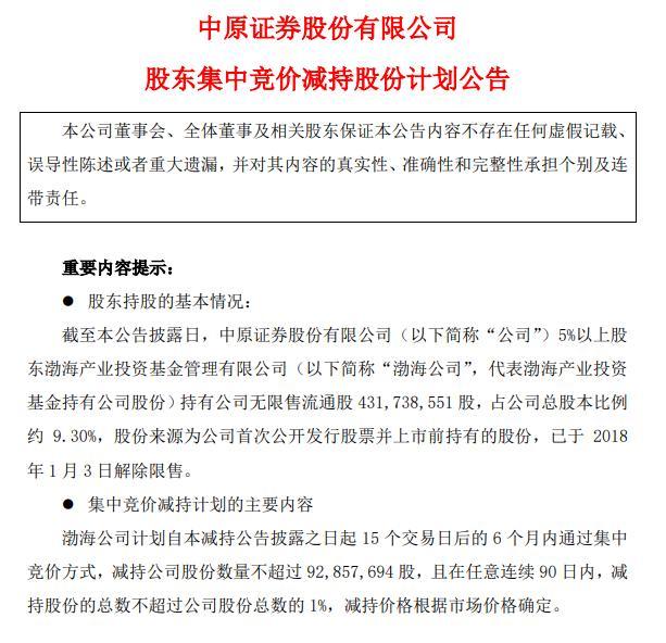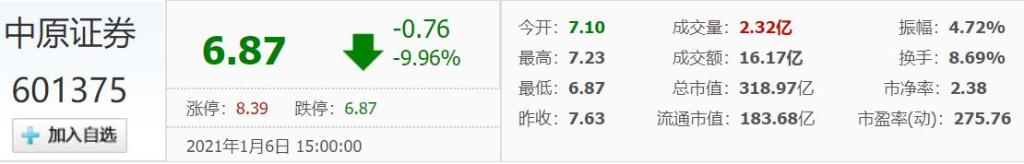中原证券今日早盘大幅低开近7%,随后略有反弹后,股价快速被砸向跌停板,截至收盘,最新报6.87元,跌9.96%,跌停板封单超43万手,估算金额近3亿元。从2020年12月25日至今年1月5日收盘,股价从5.1元快速飙涨至最高8.49元,7个交易日的区间涨幅超过66%。其中有6个交易日盘中都曾触及涨停板昨日晚间,中原证券发布公告,公司5%以上股东渤海产业投资基金管理有限公司(以下简称"渤海公司")计...