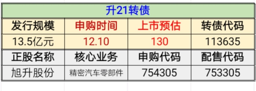 升21转债:明日申购,中签率及上市价格预测…文章来源:钳财师。12月10日,钳财师提醒大家,有1支新债可申购:升21转债。它在钳财师“待发新债列表”第21位。钳财师来分析下:一、升21转债1)正股主营业务及信用评级。正股旭升股份,总市值约221亿元,主营业务为精密铝合金汽车零部件和工业零部件的研发、生产、销售。本次可转债发行主体信用评级AA-,债券信用评级AA-,评级机构为中证鹏元。本次发行债券不...