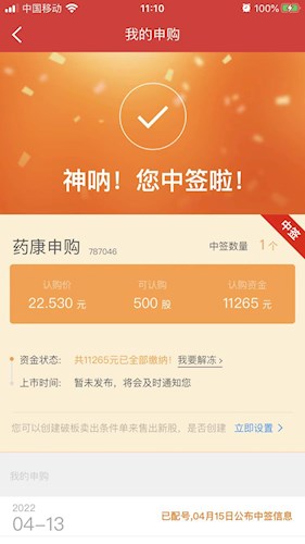 $药康申购(SH787046)$终于又中签了,要不要交钱??请指教