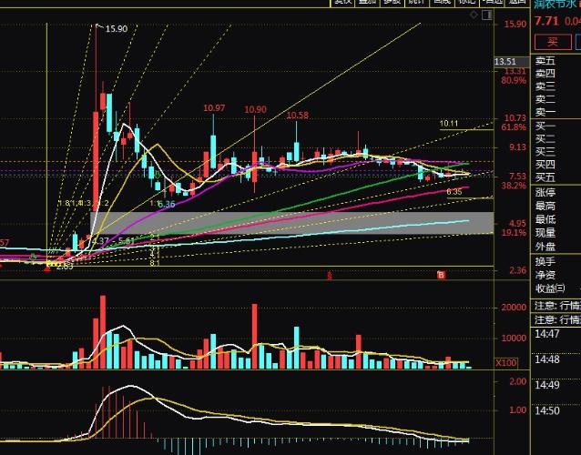 目前这个位置是个考验,可能是阶段底部,再熬2周看看能不能做出底部图形来.量是缩的很小了,如果向下破位最低可到6.35元,如果往上突破10天均线8.24元,最高可达10.11元.上下空间皆很大 下图为周K线