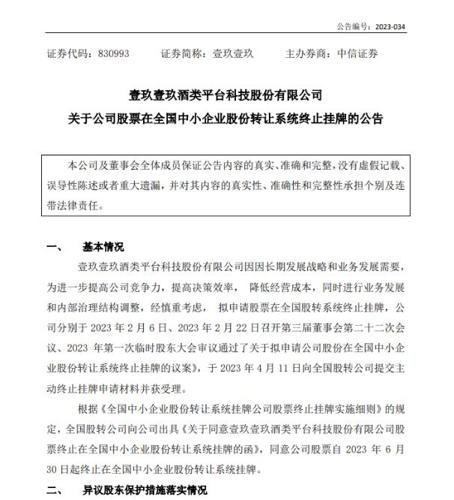 【壹玖壹玖股票今日终止挂牌】壹玖壹玖发布公司股票终止挂牌的公告。披露壹玖壹玖酒类平台科技股份有限公司因长期发展战略和业务发展需要,为进一步提高公司竞争力,提高决策效率,降低经营成本,同时进行业务发展和内部治理结构调整,经慎重考虑,拟申请股票在全国股转系统终止挂牌。根据《全国中小企业股份转让系统挂牌公司股票终止挂牌实施细则》的规定,全国股转公司向公司出具《关于同意壹玖壹玖酒类平台科技股份有限公司...