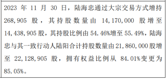 挖贝网12月1日,力阳科技(831140)发公告称,2023年11月30日,陆海忠通过大宗交易方式增持268,905股,其持股数量由14,170,000股增至14,438,905股,其持股比例由54.46%增至55.49%,陆海忠与其一致行动人陆阳合计持股数量由21,860,000股增至22,128,905股,拥有权益比例从84.01%变更为85.05%。据了解,本次权益变动不涉及相关协议、行政划...