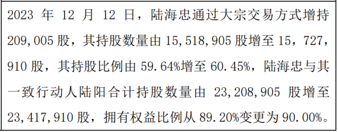 挖贝网12月13日,力阳科技(831140)发公告称,2023年12月12日,陆海忠通过大宗交易方式增持209,005股,其持股数量由15,518,905股增至15,727,910股,其持股比例由59.64%增至60.45%,陆海忠与其一致行动人陆阳合计持股数量由23,208,905股增至23,417,910股,拥有权益比例从89.20%变更为90.00%。据了解,截止本报告书签署之日,本报告书已...