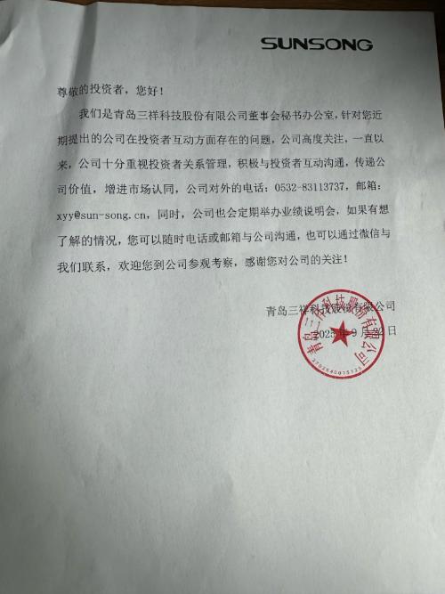 $三祥科技(SZ831195)$ 【12386服务平台】您好,感谢您使用12386服务平台。现对平台9月23日接收到的投诉三祥科技(831195)董秘没有回复投资者问题不合理事项回复如下:据北京证券交易所反馈,已与三祥科技沟通,三祥科技表示已通过短信、电话、微信等方式积极与您联系,目前尚未得到您回复,公司在官网设立投资者服务电话及邮箱,后续将不断畅通投资者沟通渠道。感谢您对我们工作的支持!