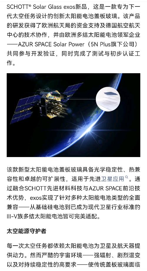 $光和光学(SZ831460)$每一次太空任务都依赖太阳能电池为卫星及航天器提供动力。然而严酷的宇宙环境——强辐射、剧烈温变以及对持续稳定性的高要求——使传统盖板玻璃面临极限挑战。要确保太阳能电池在长期任务中保持高效运转,亟需创新的防护解决方案。SCHOTTSolarGlassexos以前沿设计赋能太空长效运行。其优化配方具备卓越的紫外线吸收能力与光学稳定性,即便长期暴露于辐射环境仍能维持可靠防护...