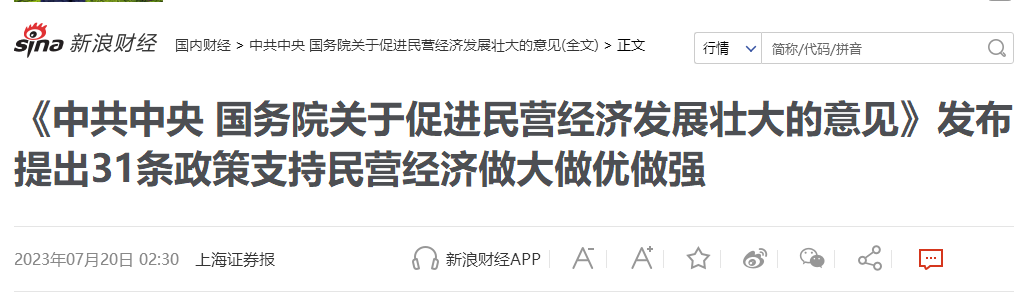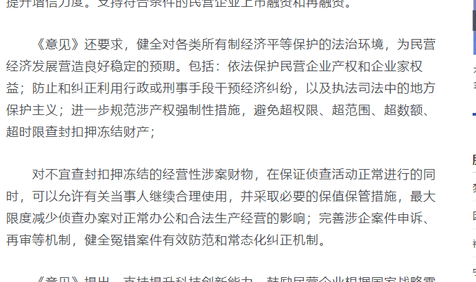 摘录有关:依法保护民营企业产权和企业家权益的内容并附截图《中共中央国务院关于促进民营经济发展壮大的意见》发布提出31条政策支持民营经济做大做优做强2023年07月20日02:30上海证券报记者李苑《中共中央国务院关于促进民营经济发展壮大的意见》(下称《意见》)19日发布,提出31条政策支持民营经济发展。...
