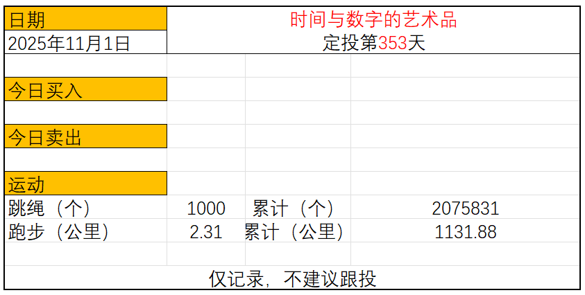 运动与投资第353天 2025年11月1日 今日定投: 周末,没有定投 跳绳:1000个,累计跳绳:2075831个 慢跑:2.31公里,累计慢跑:1131.88公里