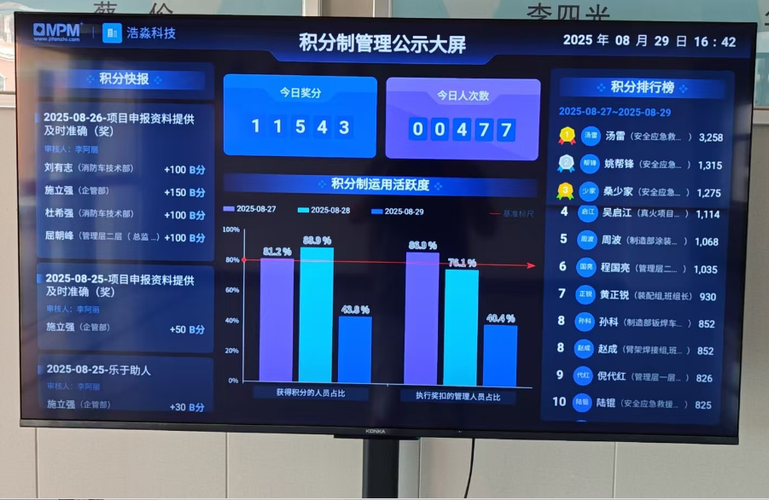 2025年9月浩淼科技生产中心篇 积分制管理激活生产新动能 2025年9月,浩淼科技生产中心全面推行升级版积分制管理,以“积分”撬动生产效能,激发组织活力,推动生产运营迈向精细化、高效化新阶段。 在公司大门侧面、办公楼大厅及各生产车间,电子积分屏实时滚动展示员工积分动态,正向激励与负向扣分一目了然。这一看得见的“数字荣誉榜”,让每位员工都能清晰衡量自身贡献,算清“收获账”,工作干劲显著提升。“凭实...