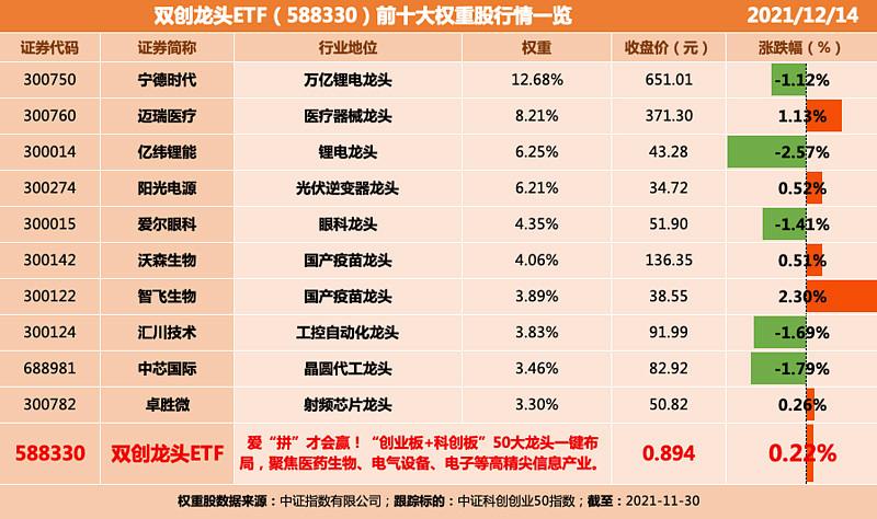 【最新提示】据上海证券交易所最新公告,双创龙头ETF(588330)现已正式被纳入融资融券(简称“两融”)标的。投资者已可通过融资融券操作,来对这只一键投资“科创板+创业板”中50只战略新兴产业龙头股的ETF进行做多(融资买入)或做空(融券卖出)的投资操作【双创龙头ETF(588330)2021年终重磅调仓概要】双创龙头ETF(588330)2021年度第二次调仓于12月13日正式生效,调仓涉及5...