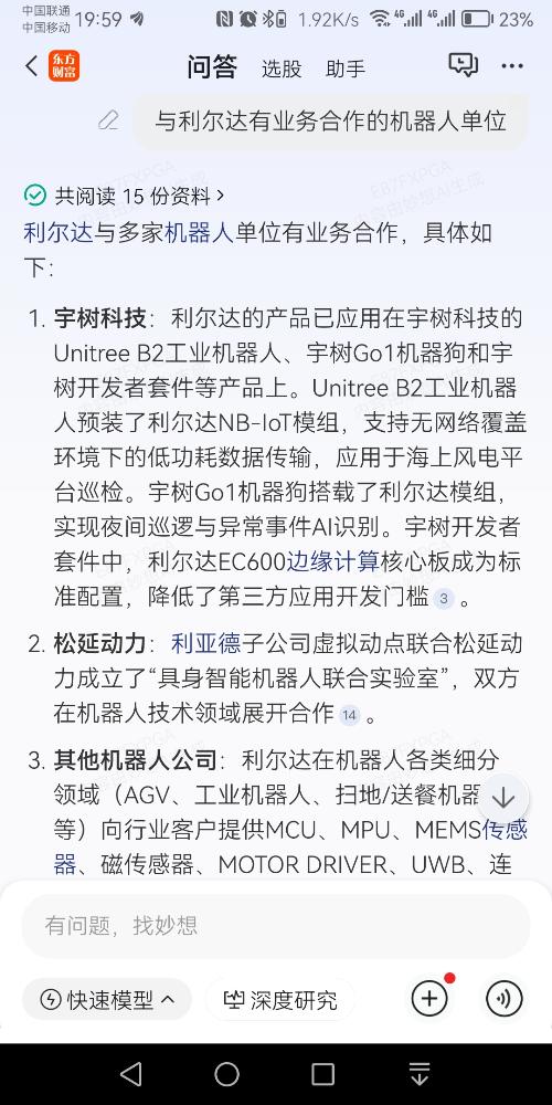 $利尔达(SZ832149)$ 东财的妙想问答里面已经非常明确告知了利尔达与宇树的合作详细信息,目前是股价中位解禁利空洗筹而已,随着宇树机器人的批量上市,公司产品销量的提升,公司估值仍存在上涨空间,握紧股票,静待花开 #强势机会##复盘记录##收盘点评#...