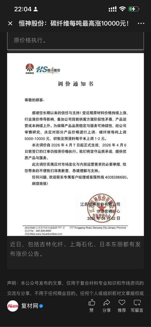 $恒神股份(SZ832397)$获悉,4月2日,江苏恒神股份发布调价通知:受原材料上涨、成本攀升影响,自2026年4月7日起,碳纤维每吨上调5000-10000元,织物及预浸料每平米上调1-2元。4月6日前签订的订单仍按原价格执行。