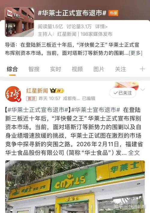 曾几何时,华莱士顶着“洋快餐之王”的光环,在神州大地上遍地开花,门店数量甚至让麦当劳、肯德基都望尘莫及。 然而,就在3月11日,“华莱士正式宣布退市”的话题却如一颗惊雷,炸上了微博热搜榜首。 据最新官方信息,华莱士母公司福建省华士食品股份有限公司已正式从新三板摘牌退市,结束了近十年的挂牌上市历程。 截图自微博 从攻城略地的本土快餐巨头,到悄然从资本市场抽身,那个陪你长大的“华莱士”,究竟怎么了? ...