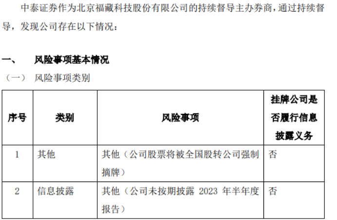 公告 福藏股份:中泰证券关于北京福藏科技股份有限公司收到终止挂牌决定的风险提示性公告