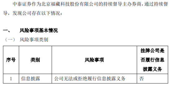公告 福藏股份:中泰证券关于北京福藏科技股份有限公司的风险提示性公告