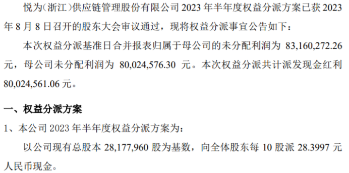 挖贝网8月9日,悦为股份(833458)近日发布2023年半年度权益分派实施公告,公司2023年半年度权益分派方案为:以公司现有总股本28,177,960股为基数,向全体股东每10股派28.3997元人民币现金。本次权益分派基准日合并报表归属于母公司的未分配利润为83,160,272.26元,母公司未分配利润为80,024,576.30元。本次权益分派共计派发现金红利80,024,561.06元。...