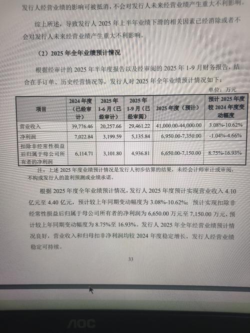 2赞- (2)2025 年全年业绩预计情况 根据经审计的 2025 年半年度报告以及经审阅的 2025 年 1-9 月财务报告,结 合在手订单、历史经营情况等,发行人对 2025 年全年业绩预计情况如下: 单位:万元 项目 2024 年度 (已经审 计) 2025 年 1-6 月(已 经审计) 2025 年 1-9 月(已 经审阅) 2025 年度(预计) 预计 2025 年度 较 2024 年度变 动幅度 营业收入 39,776.46 20,257.66 29,461.22 41,000.00-44,000.00 3.08%-10.62% 净利润 7,022.84 3,199.59 5,135.84 6,950.00-7,350.00 -1.04%-4.66% 扣除非经常性损益 后归属于母公司所 有者的净利润 6,114.71 3,101.80 4,936.81 6,650.00-7,150.00 8.75%-16.93% 注:上述 2025 年度业绩预计情况是发行人初步估算的结果,未经会计师审计或审阅, 不构成发行人的盈利预测或业绩承诺。 根据 2025 年度全年业绩预计情况,发行人 2025 年度预计实现营业收入 4.10 亿元至 4.40 亿元,预计较上年同期变动幅度为 3.08%-10.62%;预计实现扣除非 经常性损益后归属于母公司所有者的净利润为 6,650.00 万元至 7,150.00 万元,预 计较上年同期变动幅度为 8.75%至 16.93%。发行人 2025 年全年经营业绩预计情 况良好,营业收入和归母扣非净利润均较 2024 年度稳定增长,发行人经营业绩 稳定可持续。