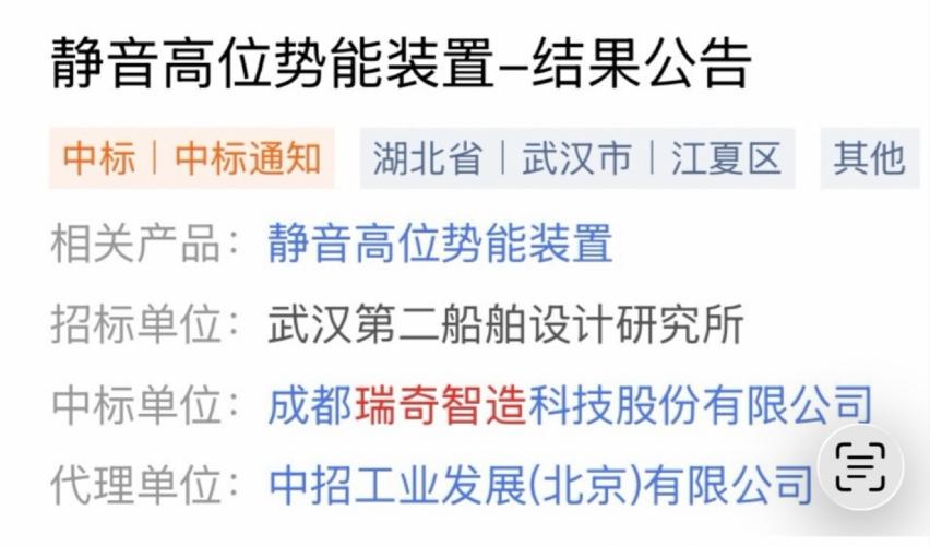 傲巴牛 发表于 09-29 16:06 351次浏览 2025年9月23日成都瑞奇智造科技股份有限公司中标了武汉第二船舶设计研究所的“静音高位势能装置”项目。体现了瑞奇智造在相关装备制造领域的竞争力,能够承接专业机构的项目订单。 武汉第二船舶设计研究所(中国船舶集团有限公司第七一九研究所)是我国唯一的核动力舰船总体设计研究所,属于国家重点科研院所。 评论3