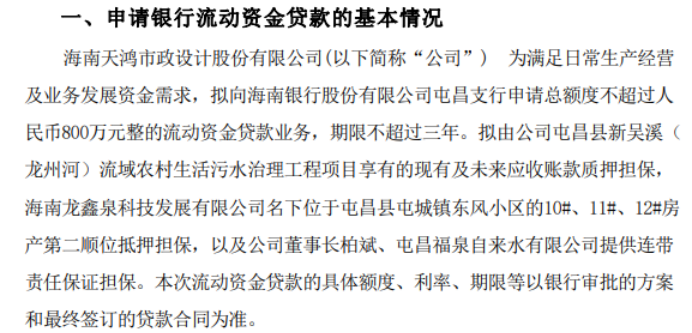 天鸿设计拟向银行申请不超过800万贷款 公司董事长柏斌、屯昌福泉自来水有限公司提供连带责任保证担保