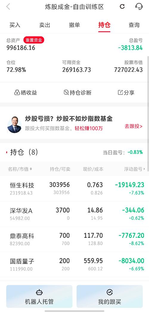 【实盘贴】72.8%仓位,单日再绿-0.83%,我却偷偷笑了 今天11:52系统提示“送货中”,我还以为快递小哥把牛市送来了,结果12:15一看——又送来一捆韭菜!账户总资产996186,回撤3813,回撤不大,侮辱性极强。仓位72.98%,手里269163现金,像极了等抄底却永远不敢下重手的自己。 先报伤亡: 1.恒生科技303956份,成本0.826,现价0.763,浮亏-7.63%,单日蒸发...