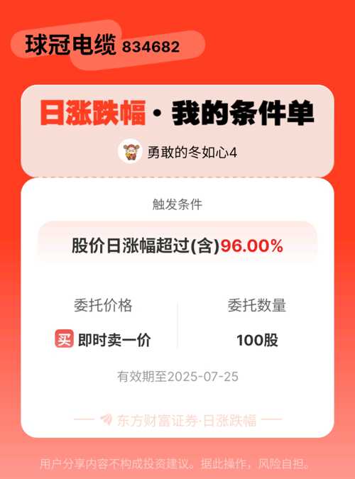 #条件单交流##日涨跌幅晒单#一位股神设置了一个日涨跌幅条件单,接下来就是见证奇迹的时刻~$球冠电缆(SZ834682)$