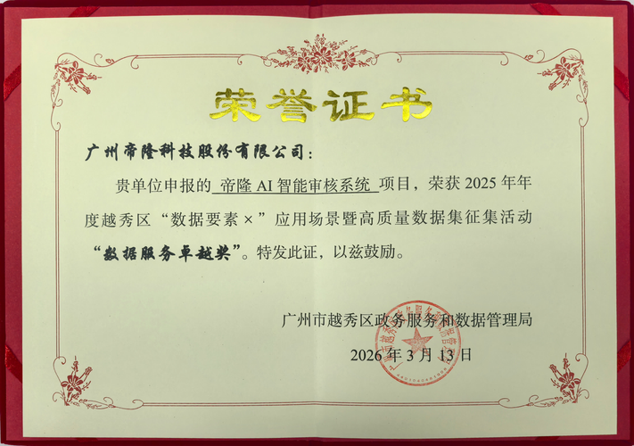 邀您观看:近日,在广州市越秀区政务服务和数据管理局主办的2025年“数据要素×”应用场景征集活动中,帝隆科技自主研发的“AI智能审核系统”成功入选十大优秀案例,并荣获“数据服务卓越奖”。