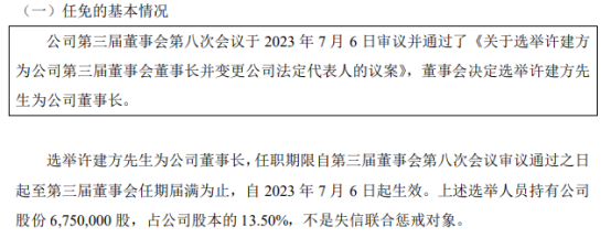 挖贝网7月6日,谐通科技(834874)发公告称,公司第三届董事会第八次会议于2023年7月6日审议并通过了《关于选举许建方为公司第三届董事会董事长并变更公司法定代表人的议案》:选举许建方为公司董事长,任职期限自第三届董事会第八次会议审议通过之日起至第三届董事会任期届满为止,自2023年7月6日起生效。据挖贝网了解,许建方持有谐通科技13.50%股份。因范丽芳辞去公司董事长职务,根据《公司法》、...