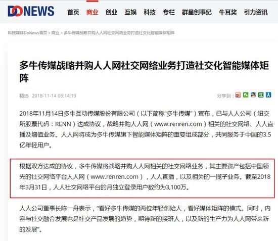 资讯 多牛传媒拟收购人人公司社交网络等资产