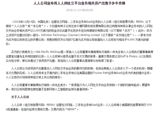 资讯 人人网出售社交平台 多牛传媒2000万美元现金对价接盘