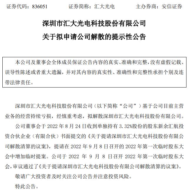 集微网消息,日前,新三板上市公司汇大光电发布公告称,基于公司目前主营业务的持续亏损,经慎重考虑,拟解散深圳市汇大光电科技股份有限公司。汇大光电董事会于2022年8月24日收到单独持有3.32%股份的股东新余汇航投资合伙企业(有限合伙)书面提交的《关于提请深圳市汇大光电科技股份有限公司解散清算的议案》,提请在2022年9月8日召开的2022年第一次临时股东大会中增加临时提案。公司于2022年9月8日...
