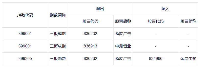三板指数样本股调整:蓝梦广告、中鼎恒业调出三板成指 金晶生物调入三板消费