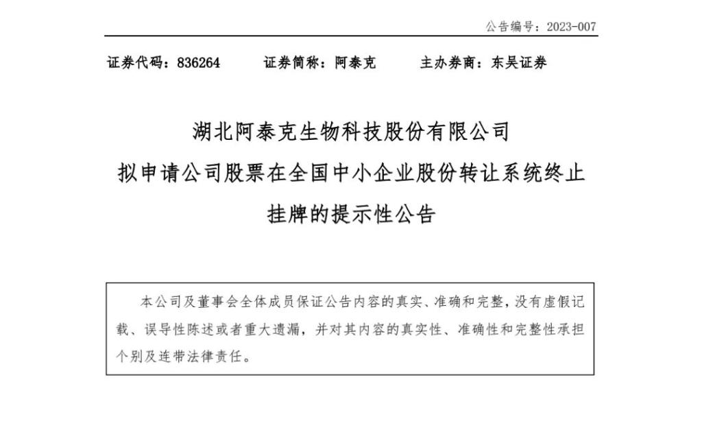 公告 关于湖北阿泰克生物科技股份有限公司股票终止挂牌的公告