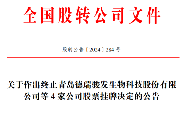 7月24日,新三板企业青岛德瑞骏发生物科技股份有限公司披露,公司于当日收到全国股转系统出具的《关于终止青岛德瑞骏发生物科技股份有限公司股票挂牌的决定》。据悉,因主办券商单方解除持续督导协议,公司未能在持续督导协议解除后的三个月内与其他主办券商签署持续督导协议,根据有关规定,全国股转系统决定终止骏发生物股票挂牌。值得注意的是,该公司股票已于2024年1月9日起停牌。据悉,骏发生物是一家马匹繁育企业,...