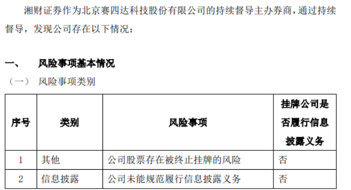 挖贝网9月11日,赛四达(836989)的持续督导主办券商湘财证券近日发布风险事项情况如下:公司股票存在被终止挂牌的风险湘财证券股份有限公司(以下简称“湘财证券”)于2023年9月8日收到全国中小企业股份转让系统有限责任公司(以下简称“全国股转公司”)出具的《关于终止北京赛四达科技股份有限公司股票挂牌的决定》(股转发〔2023〕118号)。具体内容如下:“北京赛四达科技股份有限公司:赛四达未披露2...