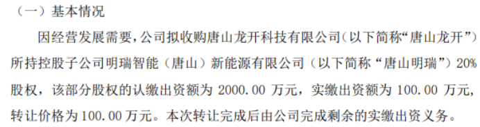 明瑞智能拟以100万收购唐山龙开所持控股子公司唐山明瑞20%股权