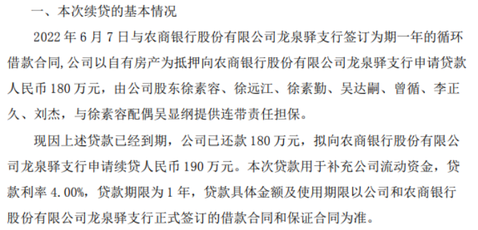 新西南拟向农商银行股份有限公司龙泉驿支行申请续贷190万 贷款利率4%