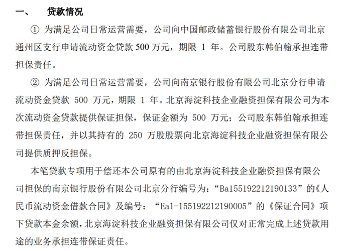 爵维科技向2家银行申请流动资金贷款1000万 由股东韩伯翰承担连带担保责任