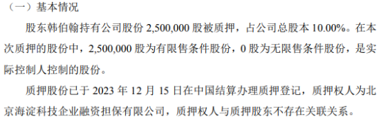 挖贝网12月19日,爵维科技(证券代码:838649)股东韩伯翰持有公司股份2,500,000股被质押,占公司总股本10.00%。在本次质押的股份中,2,500,000股为有限售条件股份,0股为无限售条件股份,是实际控制人控制的股份。质押股份已于2023年12月15日在中国结算办理质押登记,质押权人为北京海淀科技企业融资担保有限公司,质押权人与质押股东不存在关联关系。本次质押股份用作公司向银行贷款...