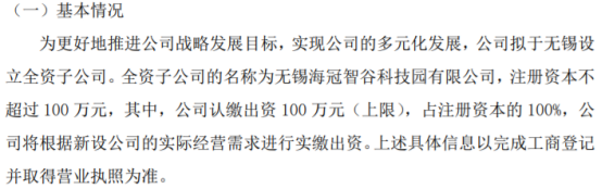 小乙物联拟投资100万设立全资子公司无锡海冠智谷科技园有限公司