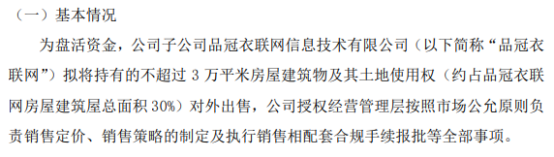 小乙物联子公司品冠衣联网拟将持有的不超过3万平米房屋建筑物及其土地使用权对外出售