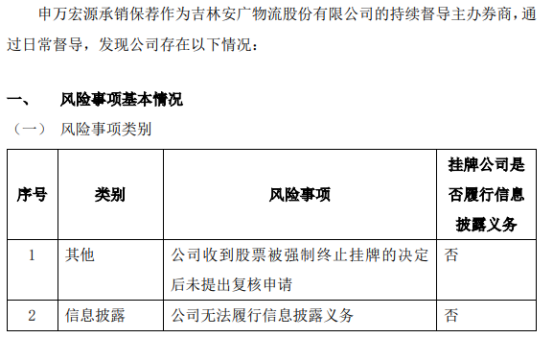 公告 安广物流:申万宏源承销保荐关于吉林安广物流股份有限公司未提出终止挂牌决定复核申请的风险提示性公告