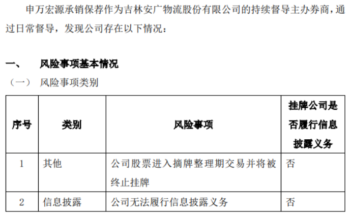 公告 安广物流:申万宏源承销保荐关于吉林安广物流股份有限公司股票进入摘牌整理期交易并将被终止挂牌的第一次风险提示性公告
