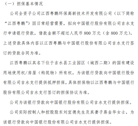 粤鹏环保全资子公司江西粤鹏拟向银行申请不超过800万借款 公司为此次借款提供担保