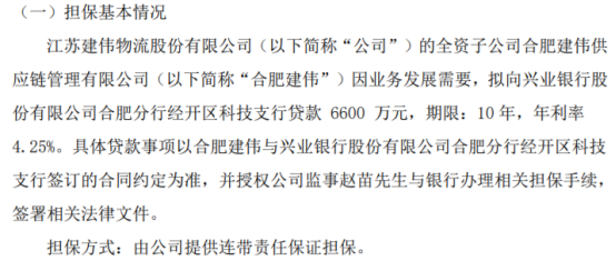 挖贝网9月4日,ST建伟(839532)近日发布公告,江苏建伟物流股份有限公司(以下简称“公司”)的全资子公司合肥建伟供应链管理有限公司(以下简称“合肥建伟”)因业务发展需要,拟向兴业银行股份有限公司合肥分行经开区科技支行贷款6600万元,期限:10年,年利率4.25%。具体贷款事项以合肥建伟与兴业银行股份有限公司合肥分行经开区科技支行签订的合同约定为准,并授权公司监事赵苗与银行办理相关担保手续,...
