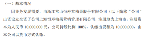 恒寿柚果拟投资1000万设立全资子公司上海恒寿柚果营销管理有限公司