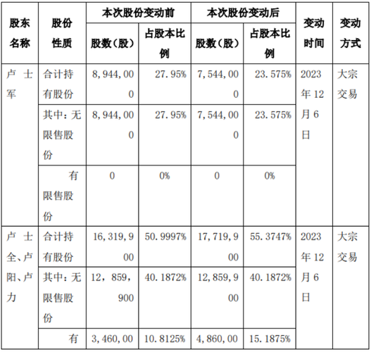 挖贝网12月8日,汇洋股份(839788)发公告称,股东卢士军于2023年12月6日在股转系统通过大宗交易方式减持140万股,权益变动前直接持股比例为27.95%,权益变动后直接持股比例为23.575%。股东卢士全、卢阳、卢力于2023年12月6日在股转系统通过大宗交易方式增持140万股,权益变动前合计拥有权益50.9997%,权益变动后合计拥有权益为55.3747%。据了解,本次股权交易不会导致...