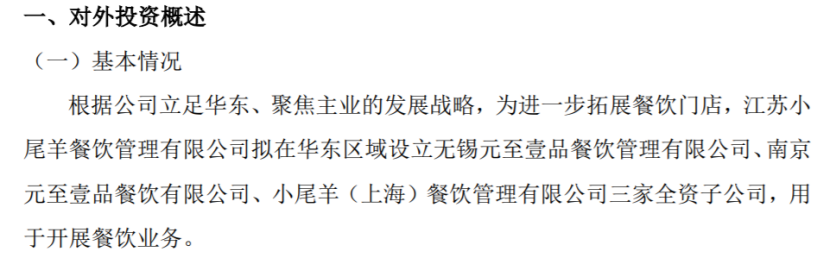 挖贝网12月18日,小尾羊(839808)近日发布公告,根据公司立足华东、聚焦主业的发展战略,为进一步拓展餐饮门店,江苏小尾羊餐饮管理有限公司拟在华东区域设立无锡元至壹品餐饮管理有限公司、南京元至壹品餐饮有限公司、小尾羊(上海)餐饮管理有限公司三家全资子公司,用于开展餐饮业务。投资标的基本情况:名称:无锡元至壹品餐饮管理有限公司注册地址:无锡市惠山区堰桥街道西昌路270号主营业务:餐饮服务、餐饮管...