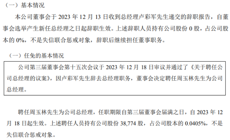 挖贝网12月18日,小尾羊(839808)发公告称,公司董事会于2023年12月13日收到总经理卢彩军递交的辞职报告,自董事会选举产生新任总经理之日起辞职生效。卢彩军辞职后继续担任董事职务。公司第三届董事会第十五次会议于2023年12月18日审议并通过了《关于聘任公司总经理的议案》:聘任周玉林为公司总经理,任职期限自第三届董事会届满之日,自2023年12月18日起生效。据挖贝网了解,卢彩军不持有小...