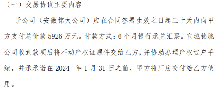 铭博股份全资子公司拟以5926万收购宣城铭驰科技发展有限公司拥有的4幢厂房及其土地使用权